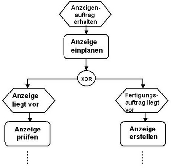 Auch hierzu ein Beispiel aus der Welt der Tageszeitungen. Das Anzeigengeschäft ist für die Verlage eine wichtige Einnahmequelle. Kommt ein Kunde zum Verlag kann es sein, dass er eine fertige Anzeige mitbringt, die er gerne veröffentlichen möchte. Es kann aber auch sein, dass er lediglich eine Idee mitbringt, wie die Anzeige aussehen soll. Dann muss diese Anzeige im Verlag noch gestaltet werden. Je nachdem ob die Anzeige mitgebracht wird oder nur die Idee vorliegt, ergeben sich alternative Abläufe im Geschäftsprozess.