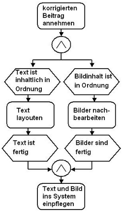 Wir haben oben bereits verschiedene parallele Abläufe gesehen. Aber da man der Beispiele ja nie genug nennen kann, folgt hier noch eines aus der Welt der wissenschaftlichen Verlage. Wir nehmen einmal an, ein wissenschaftlicher Beitrag wurde bereits von den Gutachtern zur Veröffentlichung freigegeben und vom Autor inhaltlich nachgebessert. Nun muss der Beitrag noch ins Layout (Schriftart, -größen etc.) gebracht werden und die Bilder müssen noch in brauchbare Formate und Größen transformiert werden. Erst dann wird der Beitrag ins Veröffentlichungssystem eingepflegt. Die Text- und Bildbearbeitung erfolgt von unterschiedlichen Mitarbeitern und kann selbstverständlich parallel erfolgen. Das GPM sieht dann so aus: