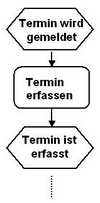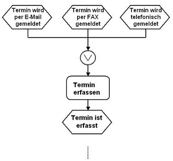 Dieser Prozess läßt sich im ersten Ereignis aufteilen. Der Termin kann den Verlag (das ist in der Realität auch so) auf sehr unterschiedliche Arten erreichen. So kann er beispielsweise als E-Mail oder als FAX geschickt werden. Es kommt auch immer wieder vor, dass die Menschen einfach anrufen und den zu veröffentlichen Termin per Telefon melden. Um diese Situation darzustellen benötigen wir eine OR-Verknüpfung. Wir hätten hier auch mit einem XOR - Konnektor arbeiten können. Allerdings sollten wir beachten, dass es passieren kann, dass ein Kunde eine E-Mail schickt und dann sicherheitshalber auch noch anruft. Dann wäre eine OR - Verknüpfung sinnvoller.