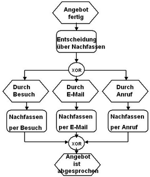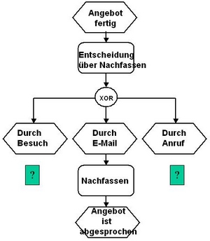 In der Abbildung links ist zu sehen, dass das Nachfassen ausschließlich aus dem Ereignis "Durch E-Mail" erfolgt. Dies ist schlichtweg falsch modelliert. Rechts ist die korrekte Modellierung zu sehen. Die Ereignisse haben jeweils eine andere Funktion (detailiertere Angabe) zu Folge. Anschließend werden die Funktionen über eine XOR-Verknüpfung wieder zusammengefasst.